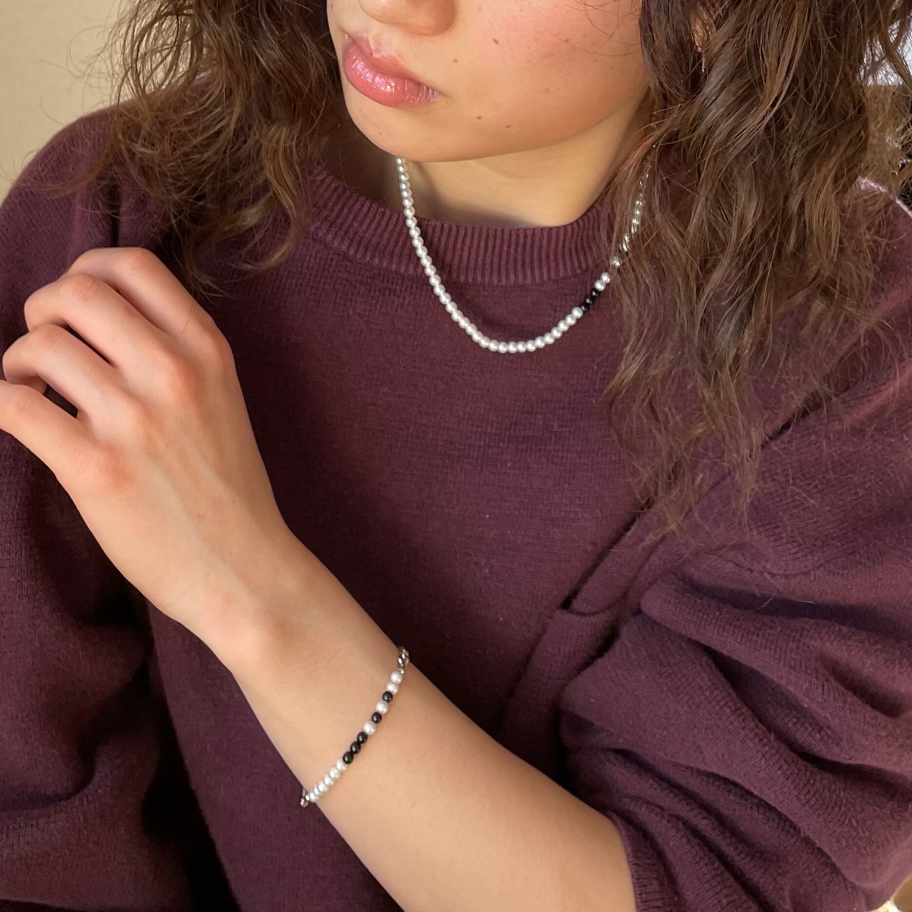 小さいパールの中に黒色の天然石を組み合わせました。